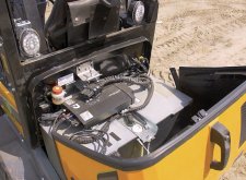 Pohon všech čtyř kol zajišťuje elektromotor o výkonu 6,5 kW. Přenos výkonu přes kardanovou hřídel poskytuje tažnou sílu až 12 500 N, což je hodnota, kterou ocení každý, kdo nakladač využívá v terénu nebo při jízdě s těžkými náklady. Samozřejmostí jsou uzávěrky diferenciálu na obou nápravách, systém Hill-Hold proti couvání na svahu i speciální režim Tow-mode, jenž poskytuje lepší výkon a ovladatelnost při přepravě těžkého nákladu nebo tažení přívěsu. Dodejme, že stroj je vybaven také rekuperací, takže při brzdění elektromotor vrací část energie zpět do baterie.