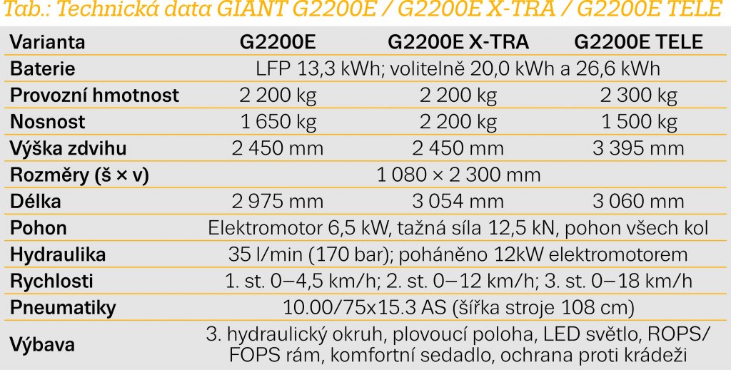 GIANT G2200E představuje logický krok do budoucnosti v oblasti manipulační techniky. Spojuje moderní elektrický pohon s robustností a funkčností, které uživatelé od značky GIANT očekávají. Je to stroj nabízející vysoký výkon bez emisí a se značně nižšími provozními náklady.