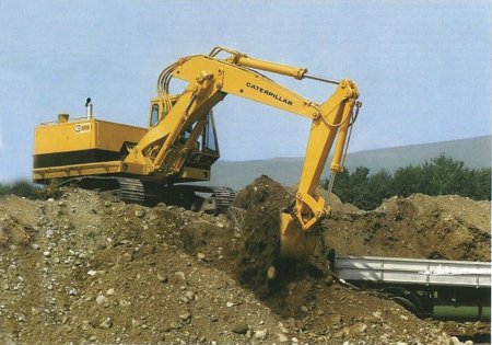 Práce na konstrukci hydraulického rýpadla a na výběru jeho pohonné jednotky začaly v tajnosti během roku 1968. Jelikož Caterpillar chtěl přijít až s vyladěným strojem, který převeze konkurenci1) , dal si na vývoji záležet a zbytečně nepospíchal. Testování prototypu tak začalo až o dva roky později v Arizoně a teprve za další dva roky, v roce 1972, bylo rýpadlo oficiálně uvedeno na trh.