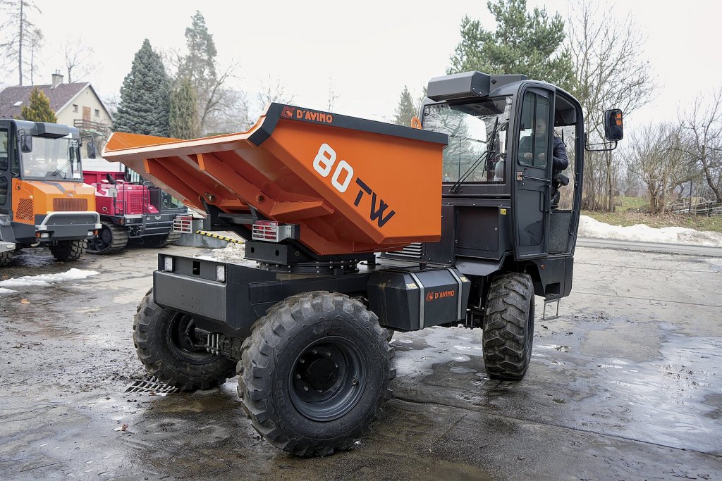 Druhým zástupcem střední třídy kabinových damprů je model Davino 80TW. Ten je koncipován odlišně – nemá kloubový rám, ale využívá řízených náprav, umožňujících stabilní jízdu i při vyšších rychlostech a při plném zatížení. Uplatnění nachází především na větších stavbách, v lomech, při zemních pracích nebo při přesunu materiálu na delší vzdálenosti po staveništi. Dobrou manévrovací schopnost zajišťují tři režimy řízení náprav: buď zatáčí pouze přední náprava (vhodné pro přesuny na silnici), nebo obě nápravy (pro malý poloměr otáčení), nebo je k dispozici režim tzv. krabího chodu. Ten se hodí například pro zavážky materiálu podél výkopů či stěn. Variabilita v řízení zvyšuje univerzálnost dampru, který je tak možné používat v širokém spektru aplikací. Devizou je také velmi dobře vybavená, prostorná a klimatizovaná kabina, kde najdeme podobně jako u předchozího modelu otočnou sedačku.
