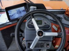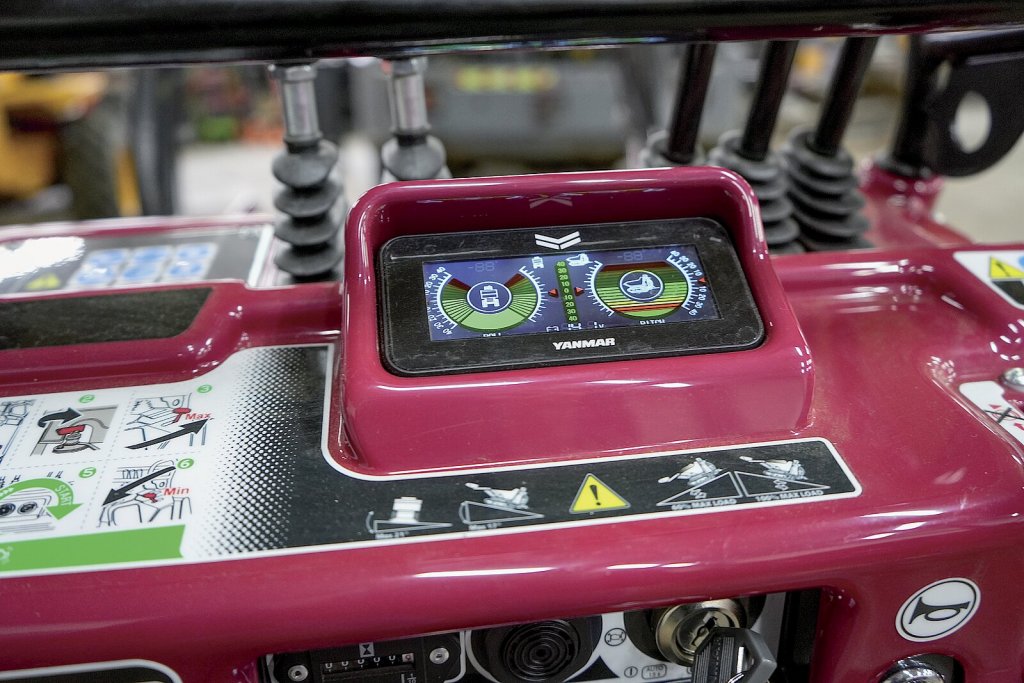 Pojďme ale zpátky k vystavenému modelu C08+. Novinkou je tu diagnostika přetížení – na předním barevném displeji vidíme dva obrysy stroje, na němž je pomocí barevné mapy zobrazováno aktuální zatížení (přední a zadní část stroje plus boční zatížení). Nová je také indikace stavu baterie. Jinak má tento dampr klasickou konstrukci s předním ergonomickým panelem, stupačkou a spolehlivým úsporným motorem Yanmar bez filtru pevných částic (DPF; 6,5 kW).