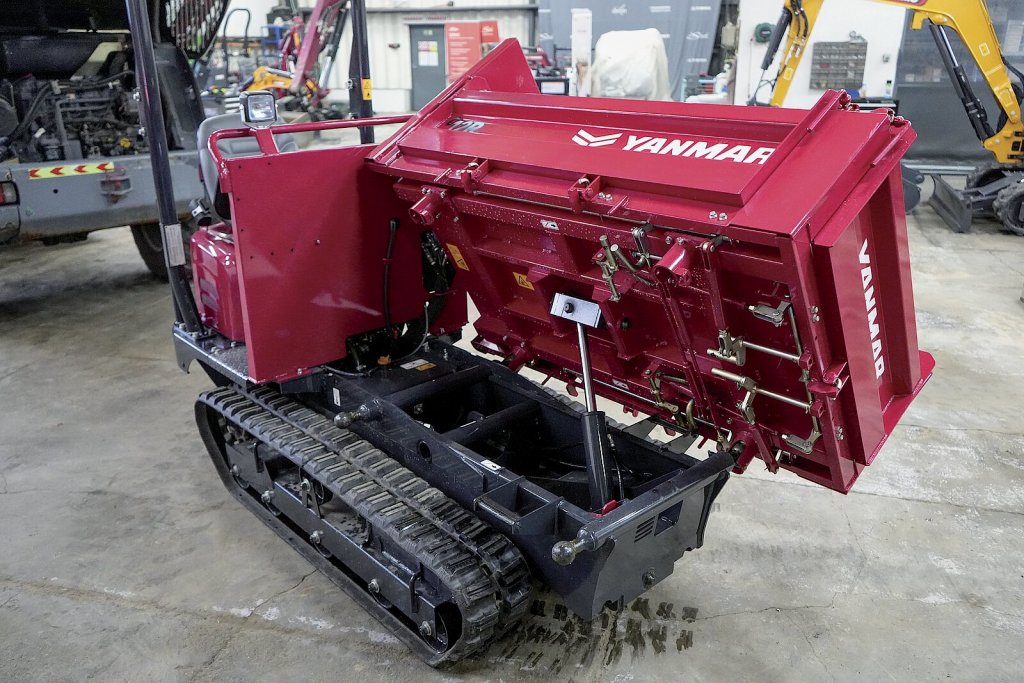 Další novinka, se kterou se v Rožnově seznamujeme, je pásový minidampr Yanmar C12R – vůbec první model v této velikostní kategorii s plnohodnotnou sedačkou. Dampr je vybaven robustní třístranně sklápěnou korbou s jednoduchým systémem zajišťovacích ok. Obsluha si zaaretuje požadovanou stranu a korba se v závislosti na tom sklápí buď rovně dopředu, nebo do stran. K jejímu ovládání slouží velká páka po levé straně strojníka; korba se zvedá hydraulicky pomocí jedné pístnice. Dampr působí velmi prakticky. Pracoviště obsluhy je prostorné, jednotlivé ovládací prvky jsou logicky rozmístěny. Na zemi po pravé straně najdeme plynový pedál, na panelu uprostřed vidíme dvojici pák sloužící k zatáčení (každá páka brzdí jeden pás). Stroj má několik zajímavě řešených detailů, například úložný prostor za sedačkou v podobě uzavíratelné brašny.