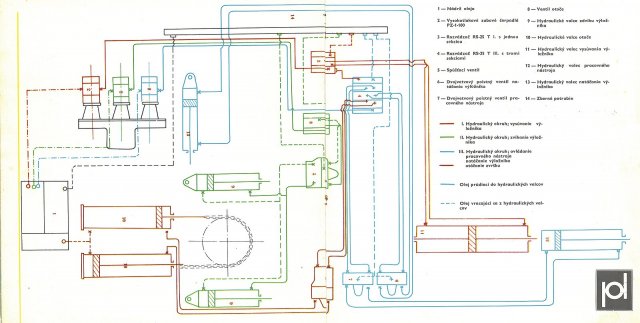 Celý hydraulický systém, rozdělený do tří pracovních okruhů, sloužil k ovládání válců pracovního ústrojí a umožňoval současně vykonávat až tři pracovní pohyby. Rozvaděče ovládané pákami se nalézaly v kabině řidiče. Hydraulický systém spolehlivě pracující v rozmezí teplot od mínus 20 do plus 80 stupňů naplněný olejem ON 3 měl též mechanický a magnetický čistič umístěný v nádrži.