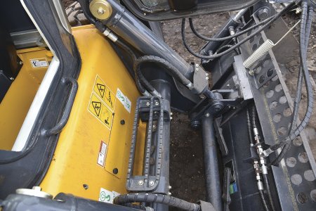 Tentokrát začneme netradičně od rámu stroje. Jak nám potvrdil produktový manažer AB rent CZ, Ing. David Hloušek, zde se nachází jedna z podstatných konstrukčních výhod nakladačů. Obě pístnice svírají vůči ramenu úhel 35°, což má několik výhod. V prvé řadě díky takto umístěným pístnicím je potřeba ke zdvihu ramene vyvinout mnohem menší sílu, než u některých konkurenčních strojů. Navíc síla vyvinutá pístnicí působí šetrně do oceli rámu, takže se podstatně prodlužuje jeho životnost. V neposlední řadě nedochází díky tomuto jednoduchému řešení k nadměrnému zanášení předního prostoru bahnem a na pracovní nástroj je z kabiny dobře vidět. Pevná lichoběžníková konstrukce výložníku je odolná vůči zkroucení a dobře pohlcuje rázy, proto může být nakladač bez obav nasazen i na vysokofrekvenční rozbíjení hornin. K celkové pevnosti přispívají dále roboticky svařované komponenty rámu a podvozku. Jinak tu najdeme spoustu prvků, které jsou identické se špičkovými stroji na trhu – nechybí například podle evropských norem homologovaný rychloupínač, závěs nebo samo nivelační ventil, udržující pracovní nástroj ve vodorovné poloze a zabraňující tak nežádoucímu vysypávání materiálu z lopaty.