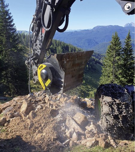 Pro specifickou zakázku uprostřed rakouských Alp byla do výšky bezmála 1 800 m n. m. dopravena drticí lžíce MB-L140. Také ta se na místo dostala prostřednictvím vrtulníku. Instalována byla na rýpadle značky Kaiser, které tu pokládalo kabely infrastrukturní sítě. V náročném terénu, na stavbě se značně omezeným prostorem, sloužil mobilní čelisťový drtič MB Crusher k rozdrcení vytěžených kamenů, přičemž podrcený materiál stavbaři použili k zasypání příkopů. Žádná přeprava, žádné nadbytečné emise, žádné náklady navíc. Chtělo by se říci „čistá práce“.