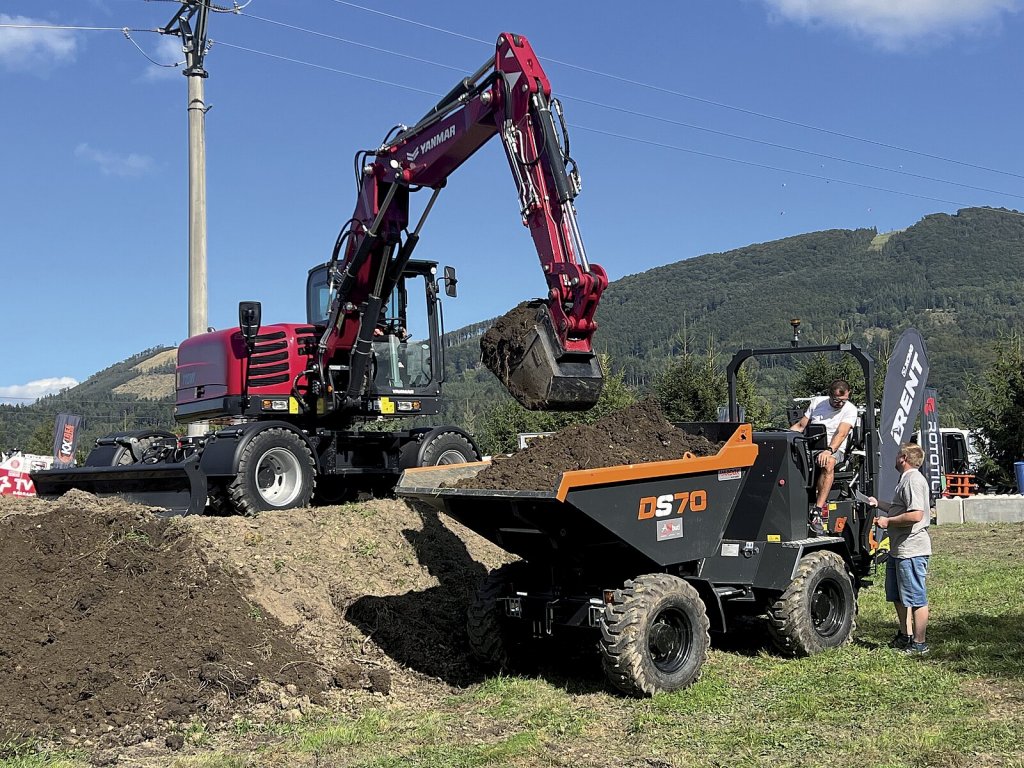 Z další techniky Yanmar sem dealer z Valašska dovezl například dvojici pásových minidumperů Yanmar C08 a C12R. V této kategorii strojů jsme byli zvědavi také na poměrně čerstvou novinku v portfoliu – pásové minidumpery Byzzon. Ty jsou zajímavou alternativou ke klasickým zavedeným značkám, v poměru cena výkon vítězí u celé řady zákazníků napříč odvětvími. Kromě stavebnictví se tyto malé obratné stroje prosazují například v komunálu, zahradnictví, lesnictví nebo zemědělství. Zvláštní pozornost si zasloužily dva výjimečné statické „exponáty”: závodní speciál Tatra a armádní verze Tatry, zapůjčené díky spolupráci s nedalekou kopřivnickou automobilkou.