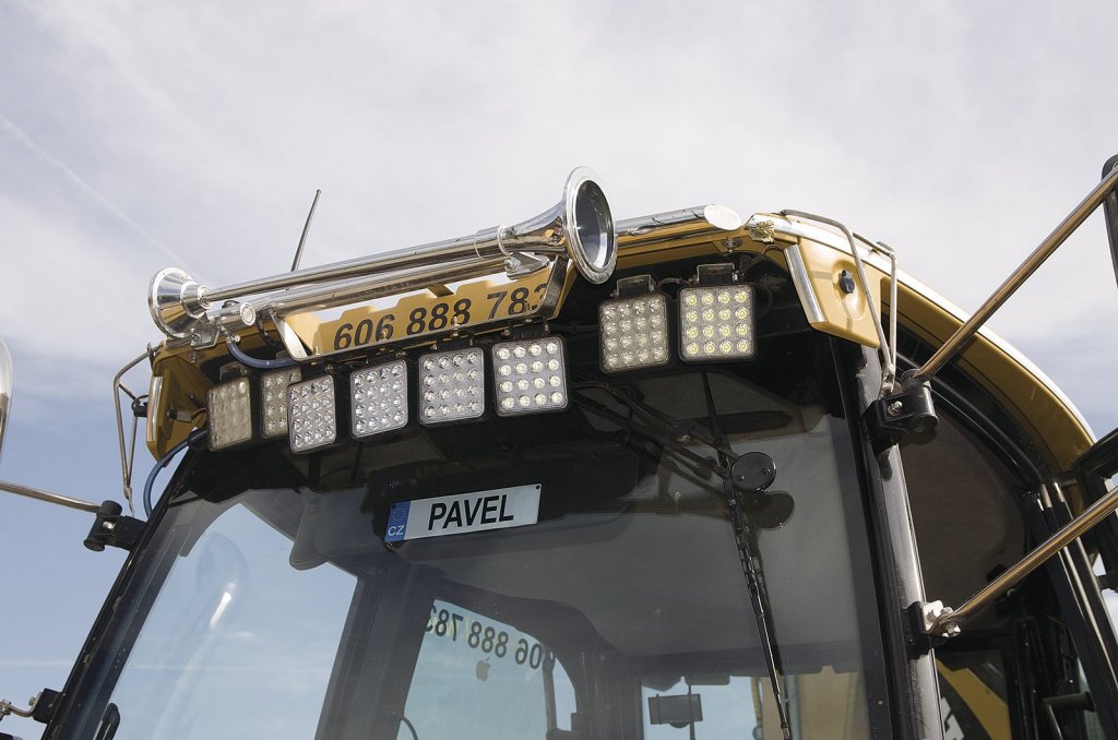 Jak už jsem zmínil, kabina traktobragru je nyní v horní části vybavena výkonnou světelnou rampou, uprostřed které se vyjímá nádherná trumpeta klaksonu. Klakson je poháněn dodatečně namontovaným kompresorem a má také svou bezpečnostní funkci. Při opuštění kabiny lze skrytým tlačítkem aktivovat alarm, a pokud by někdo otevřel dveře, trumpeta klaksonu to dá svému okolí pořádně vědět. Dominantou je také stříbrný výfuk z nerezové oceli, který dává Catu tak trochu americký vzhled.
